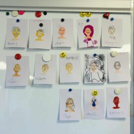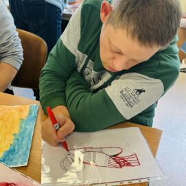 Po šių prasmingų apmąstymų kibome į kūrybą – kiekvienas tapome menininku: kūrėme savo meną taip, kaip jį jaučiame, suvokiame, patiriame. Užsiėmimo pabaigoje netgi turėjome galimybę save pavaizduoti taip, kaip matome save šiandien – per spalvą, formą, emociją.