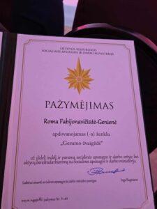 Šią dieną Socialinės apsaugos ir darbo ministerija įteikė aukščiausią apdovanojimą „Gerumo žvaigždė“ mūsų organizacijos direktoriaus pavaduotojai socialiniams reikalams Romai Fabijonavičiūtei-Genienei.