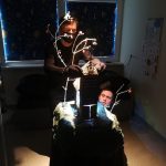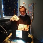Taigi, prieš Kalėdas, gruodžio 21, 22 ir 23 d. centro klientams ir darbuotojams pristatėme Beno E. sumanytą koplytėlę, kurią ligi šiol vis vadindavom bažnyčia. Suvaidinome apie 30 – 40 kartų. Psichologo kabinete įrengėme vaidinimo aikštelę ir kvietėme jaunuolius užeiti po vieną. Jiems uždėdavome ausines, kuriose skambėjo ansamblio Gyvata atliekama adventinio periodo lietuviška daina „Sodai Sodai Leliumoj“: