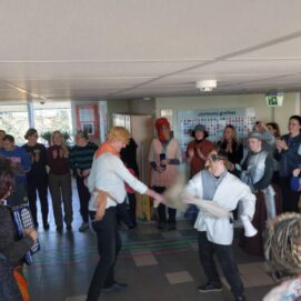 Persirengėlių būrys su linksmu muzikantu aplankė ir kitus įstaigos padalinius – Lakštučių g. 6 ir Smiltelės g. 14, nešdami juoką, triukšmą ir žiemą lauk varančią nuotaiką. Šventės dalyviai stebėjo Kanapinio ir Lašininio audringą kovą, kuri, kaip ir kasmet, simbolizavo žiemos ir pavasario dvikovą.